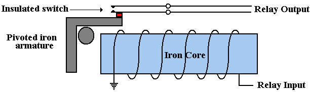 The following figure illustrates the operation of an electromechanical relay. The iron core acts as an electromagnet. When the core is activated, the pivoted iron armature is drawn towards the magnet, raising the lower contact in the relay until it touches the upper contact, thereby completing a circuit. Thus electromechanical relays are switches.