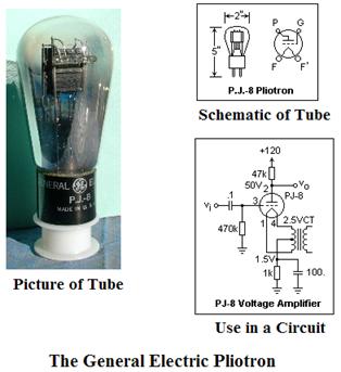 picture of an early vacuum tube, along with its schematic and a circuit showing